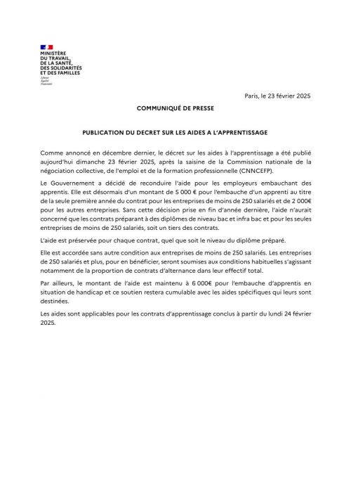 Pour rappel, cette aide unique à l'apprentissage concernant les entreprises de moins de 250 salariés (pour le recrutement d’un apprenti préparant un titre ou diplôme jusqu'au niveau baccalauréat (ou bac+2 pour les Outre-mer)) n'a pas besoin d'un décret pour être applicable en 2025.