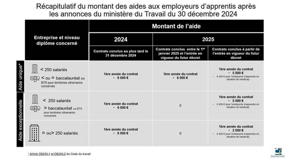 Ces nouvelles aides remplacent l’aide unique qui bénéficiait aux seuls employeurs de moins de 250 salariés pour les niveaux Bac et infra depuis le 1er janvier 2025 dernier.