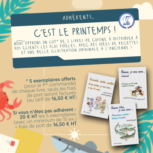 Adhérents, si vous souhaitez faire un cadeau à vos clients, souvenir de vacances ou vos clients réguliers, des petits livres de recettes pour accompagner vos poissons vous sont offerts* par l'OPEF !